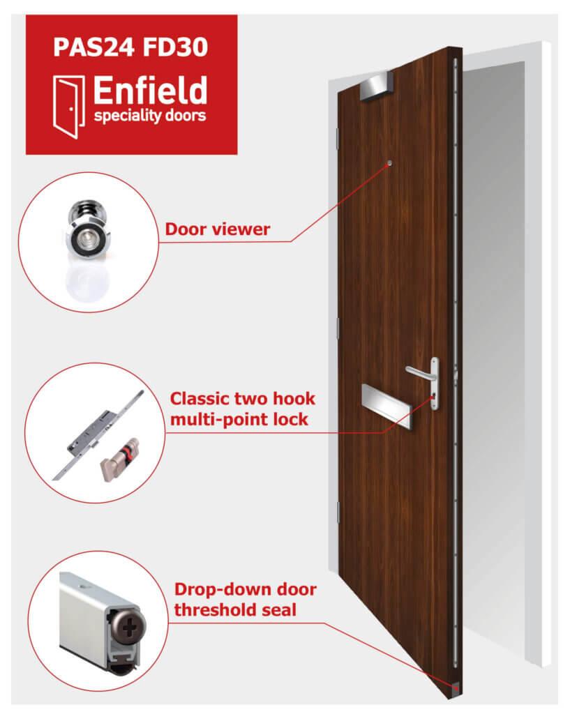 Fire-resistant security entrance doorsets are now available from UK manufacturer Enfield Speciality Doors. The PAS24 FD30 doors are certified for fire and security and are ideal for internal entrance door specifications for apartments.